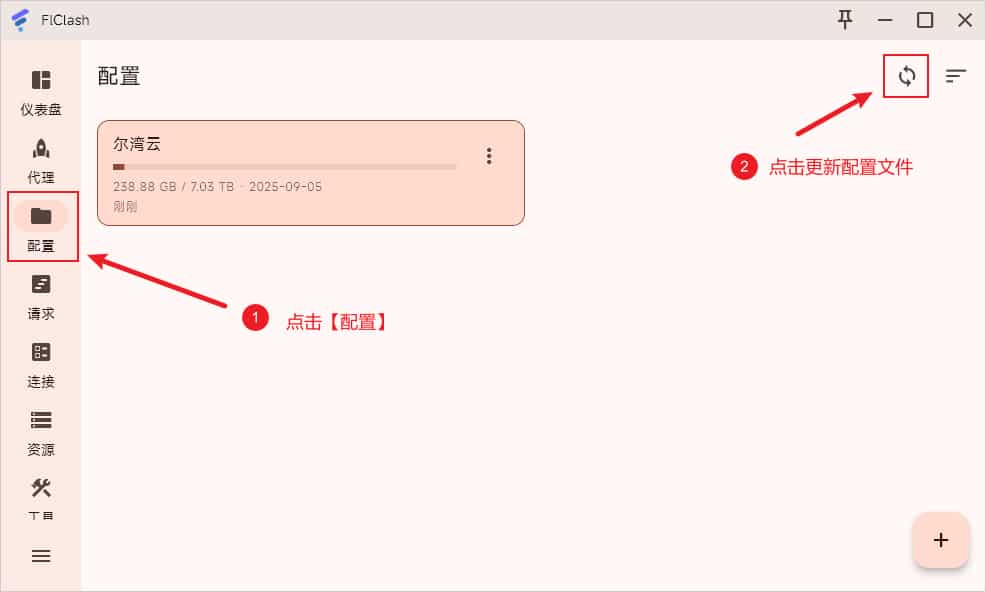 本地配置文件即通过本地文件拖拽导入,一般为无法通过远程订阅地址导入的情况下使用,可尝试在浏览器中下载配置文件后,然后点击界面左侧菜单配置,点击右下角➕键,如下图所示。